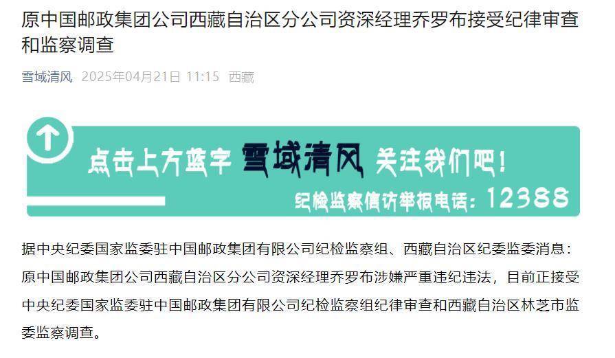 据中央纪委国家监委驻中国邮政集团有限公司纪检监察组、西藏自治区纪委监委消息:原中国邮政集团公司西藏自治区分公司资深经理乔罗布涉嫌严重违纪违法,目前正接受中央纪委国家监委驻中国邮政集团有限公司纪检监察组纪律审查和西藏自治区林芝市监委监察调查。